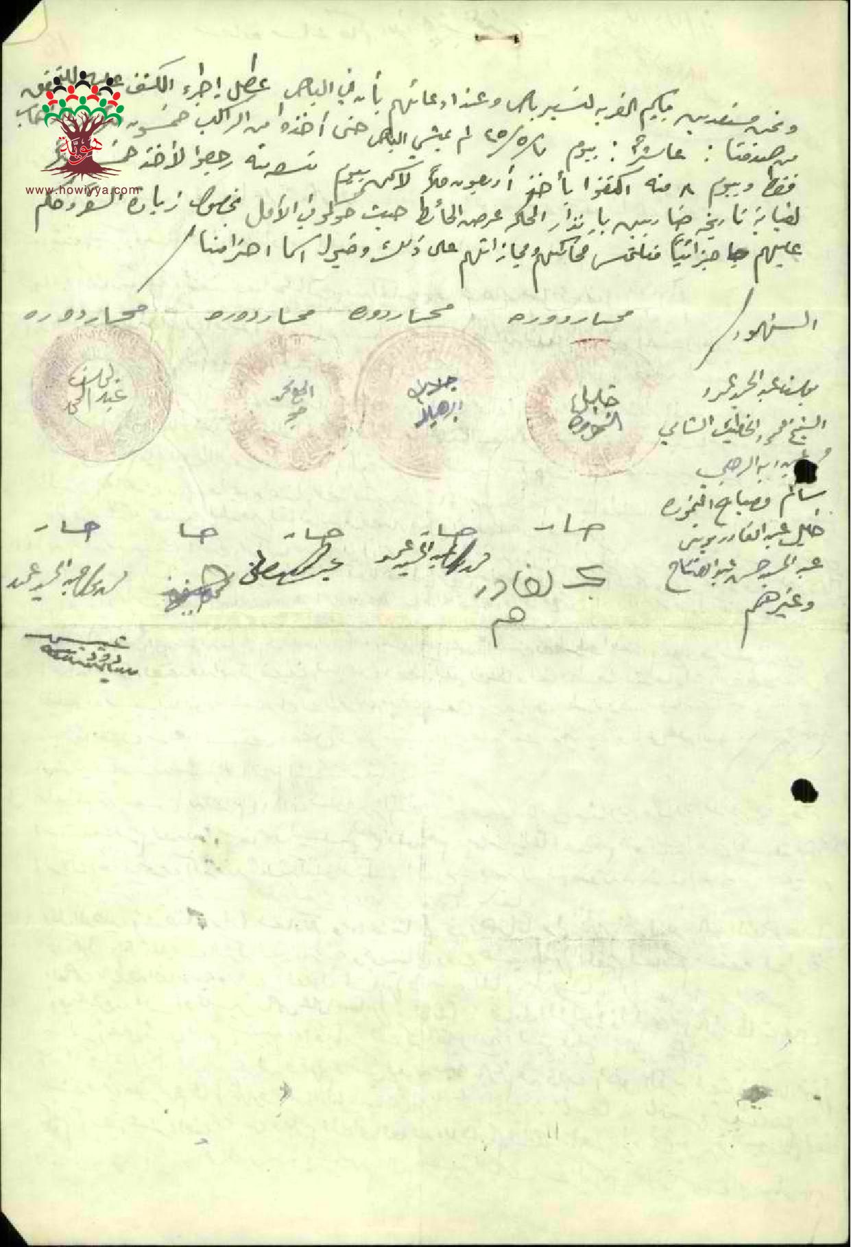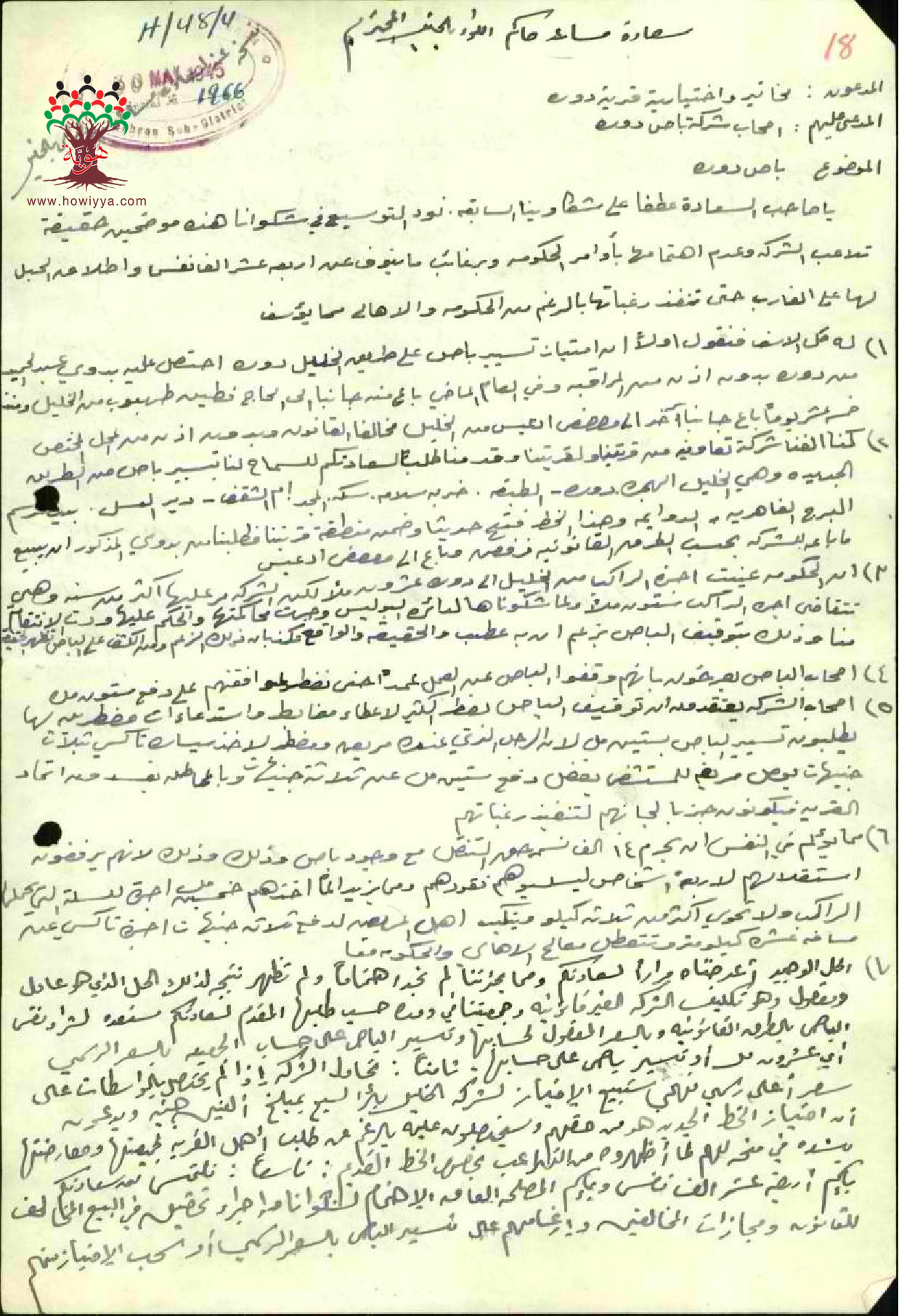 رسالة من مخاتير قرية دورة الى مساعد حاكم لواء الخليل يشتكون فيها على أصحاب باص دورة وتعرفة النقل العالية