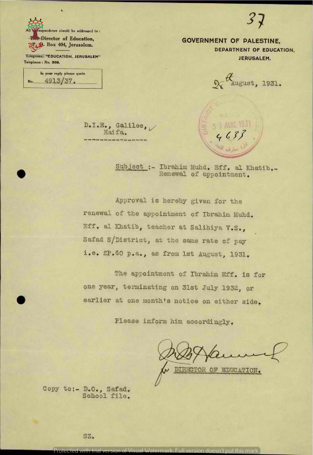 رسائل بخصوص تجديد تعيين المعلم ابراهيم الخطيب في مدرسة الصالحية لمدة سنة واحدة براتب 60 جنيها فلسطينيا في السنة