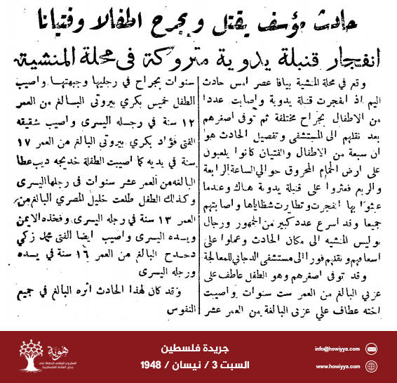حسب تقرير محطة الشرطة في الحيّ، سكن في المنشية عام 1944 حوالي 12 ألف فلسطين وحوالي 1000 يهودي. امتدت أراضي القرية على مساحة 2400 دونم. رغم البيارات الكثيرة التي منتشرة حينئذ بالمنطقة، اعتاش أغلب سكان المنشية من التجارة. بناء على تقرير محطة شرطة المنشية من عام 1944، كان في الحي 12 مخبزاً، 20 مقهى، 14 منجرة، 3 محالّ لتصليح الدراجات الهوائية، 5 أطباء، 7 مصانع، 7 محال للمجوهرات والصياغة، 6 فنادق، 10 مغاسل، 3 صيدليات، 3 دور للطباعة، 6 مطاعم، محطة كهرباء والعديد من المشاغل والمحال التجارية. أقيمت أغلب هذه المحالّ في شارع المحطة، سوق اليهود، شارع العالم وشارع حسن بك.