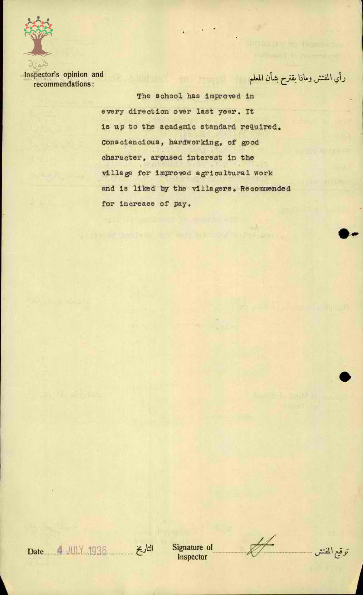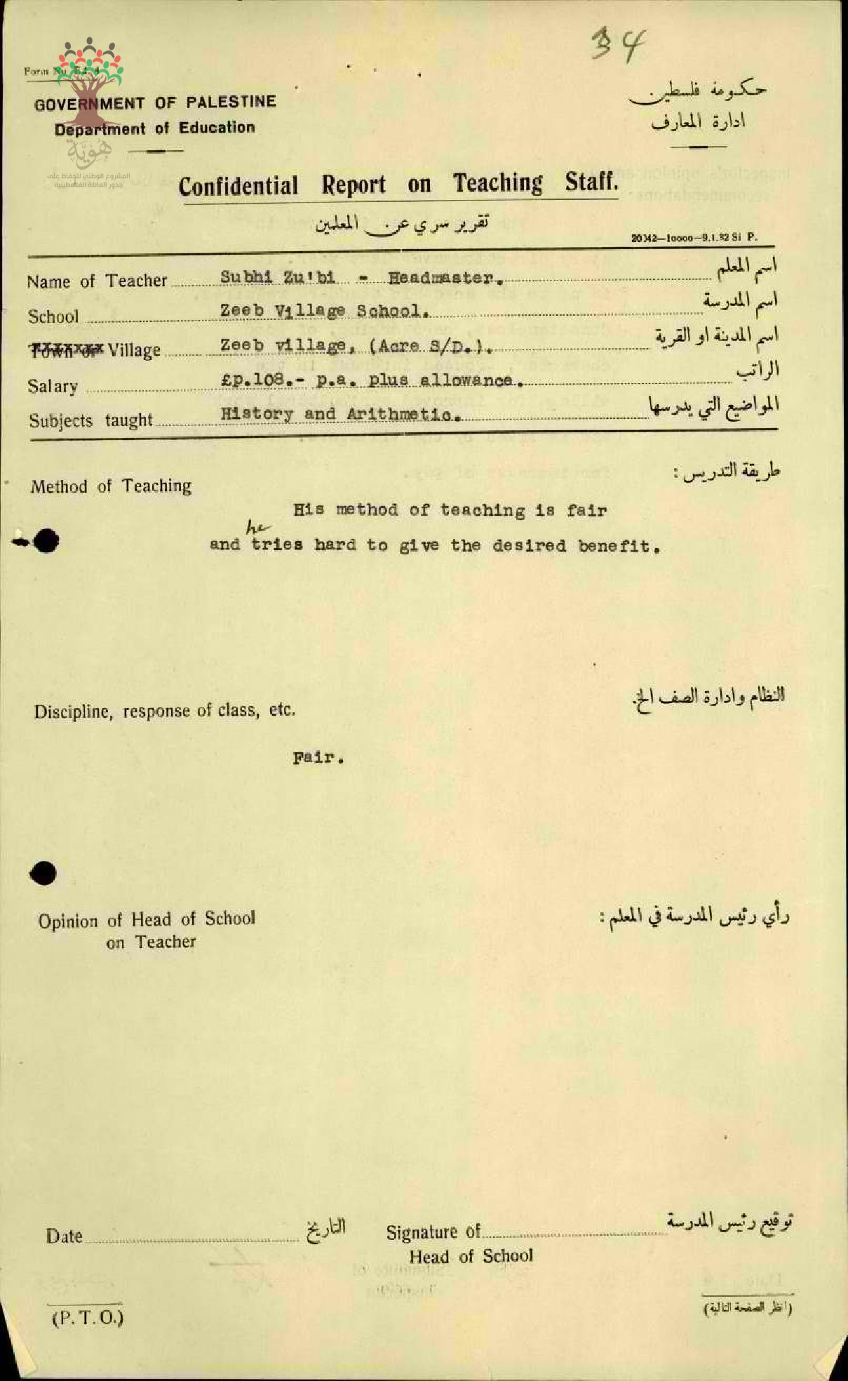 تقرير تفصيلي عن أداء المعلم صبحي الزعبي في مدرسة الزيب سنة 1936
