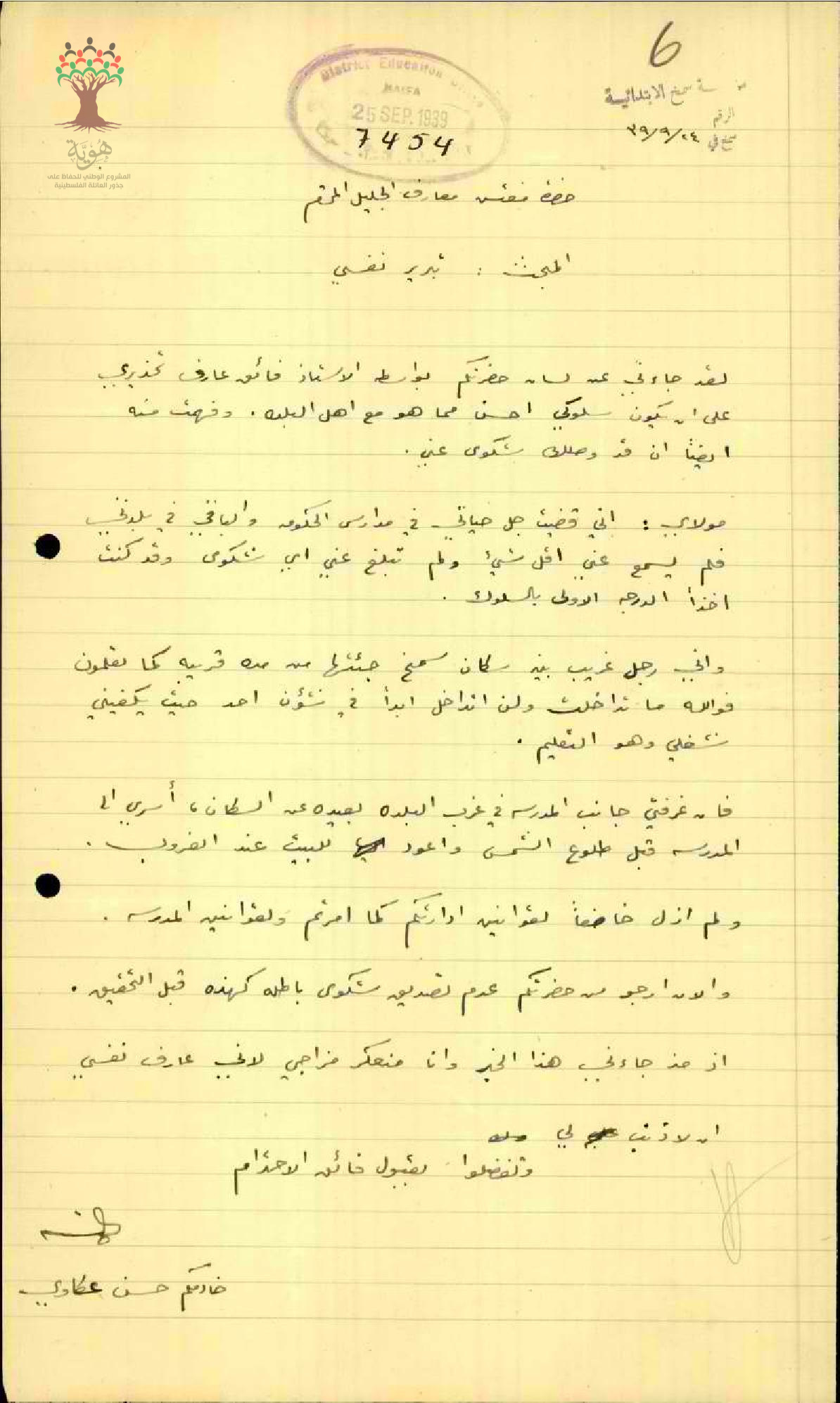 رسالة تبرير سلوك مقدمة من المعلم حسن عكاوي من مدرسة سمخ، موجهة لمفتش المعارف يتحدث فيها عن تفاصيل حياته وامتثاله لقوانين المدرسة المعمول بها