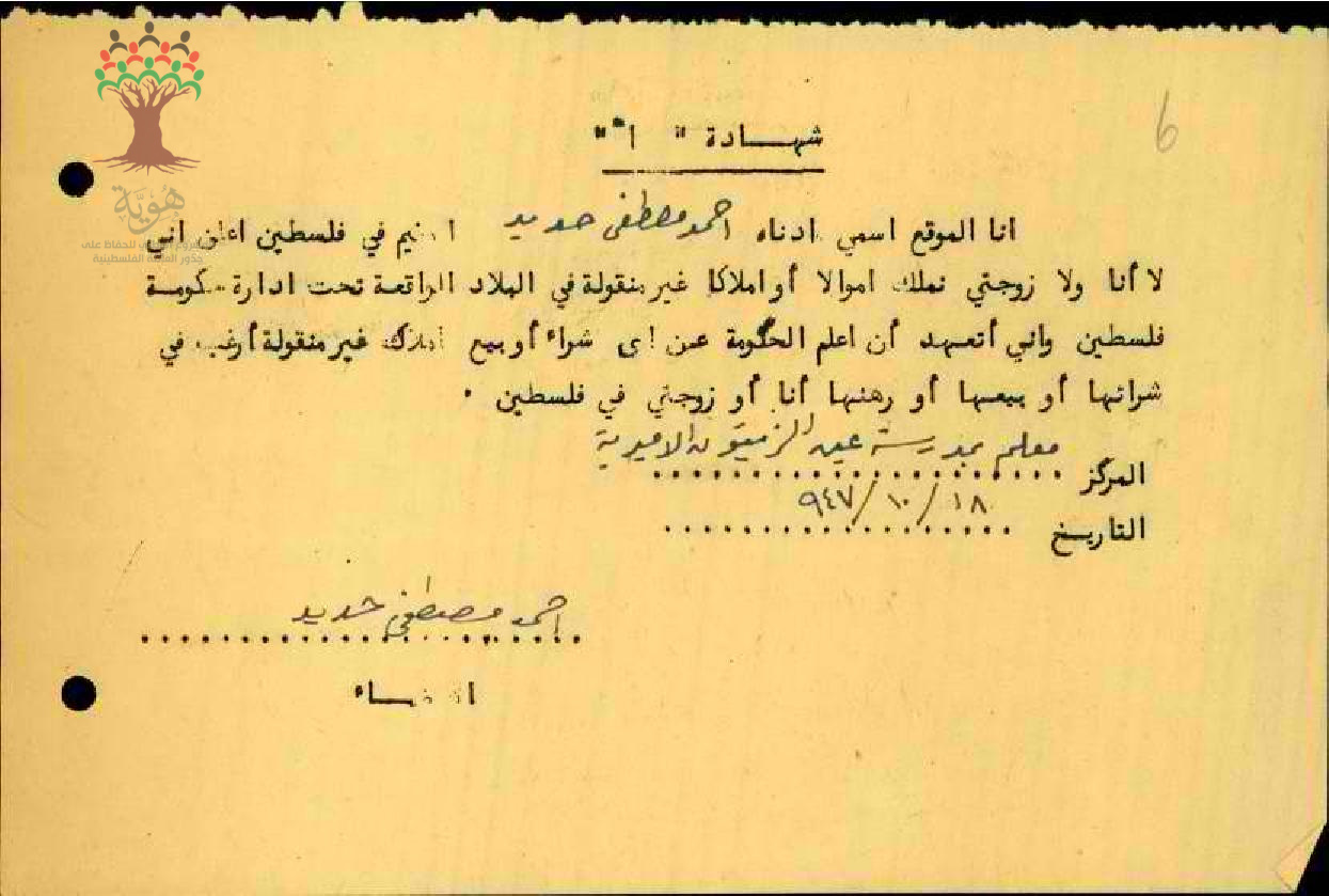 شهادة نفي ملكية من المعلم احمد مصطفى حديد - صفد