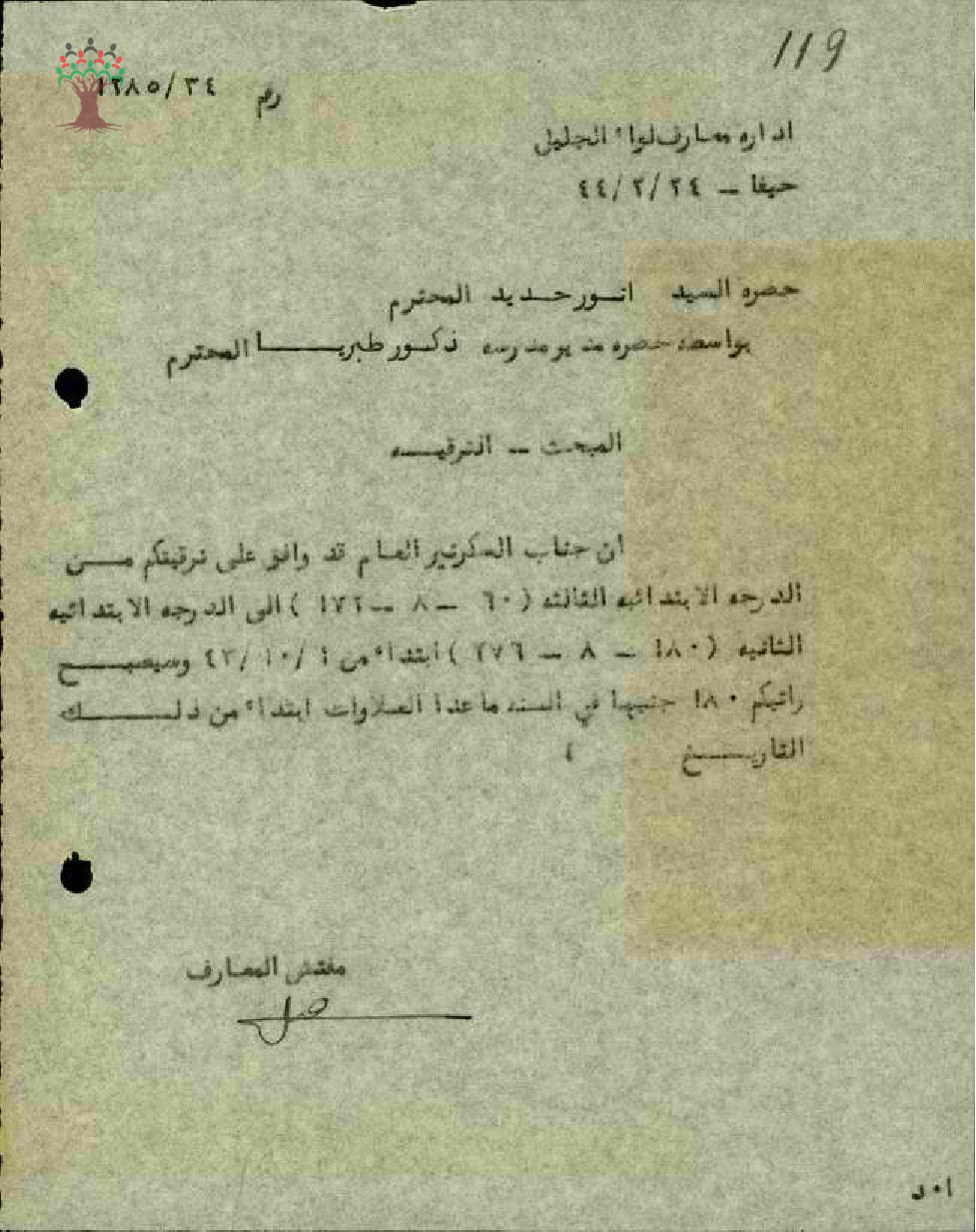 رسالة من مفتش المعارف الى المعلم انور حديد بخصوص السكرتير العام قد وافق على ترقبتكم من الدرجة الابتدائية الثالث