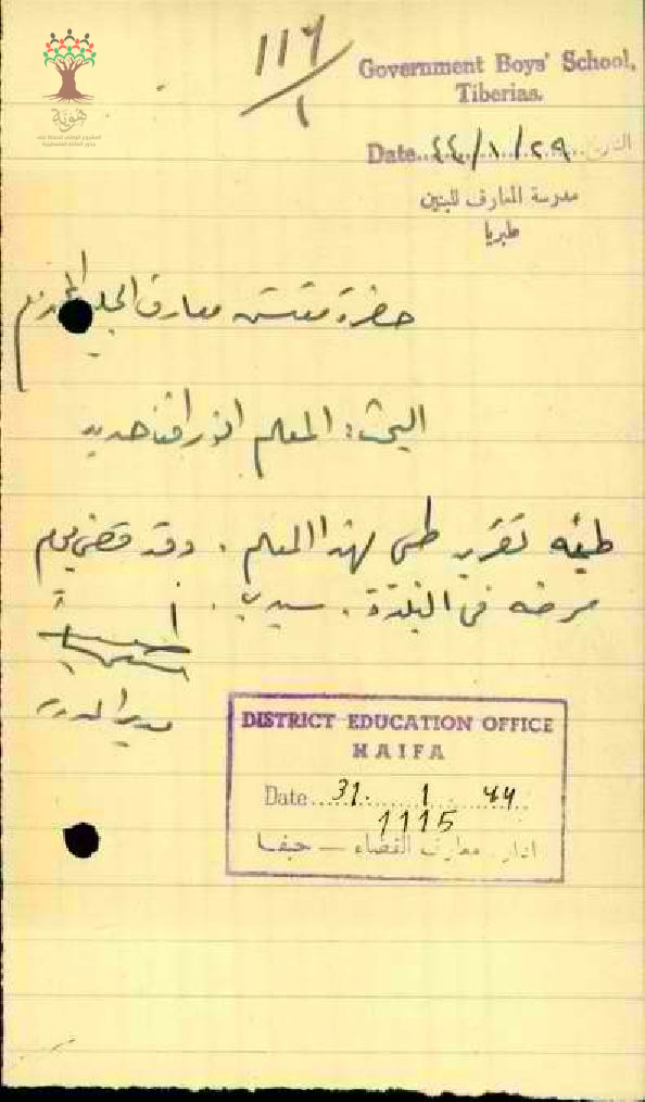 رسالة من مدير المعارف الى مفتش معارف الجليل بخصوص تقرير طبي عن المعلم انور حديد
