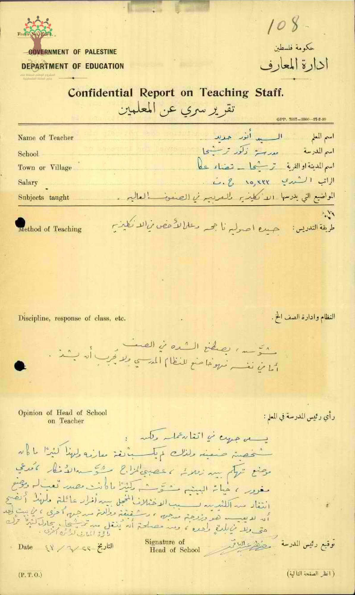 حكومة فلسطين ادارة المعارف تقرير سري عن المعلم انور حديد في مدرسة ذكور ترشيحا _طريقة التدريس _جيد اصوليه ناجحة وعلى الاخص في الانكلزي