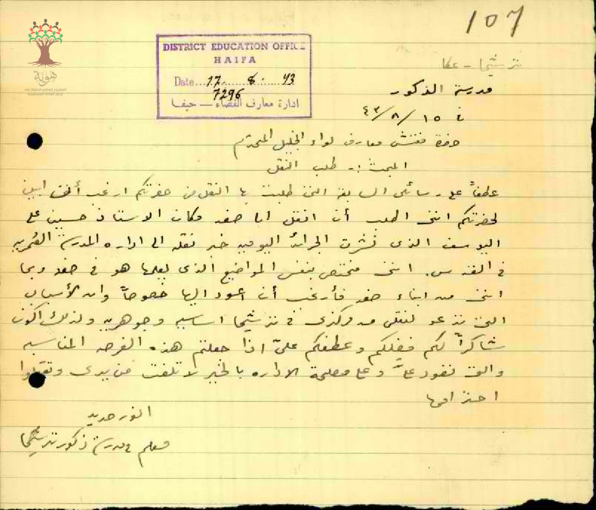 رسالة من المعلم انور حديد الى مفتش معارف الجليل عطفا على رسائلي السابقة التي طلبت بها النقل من حضرتكم