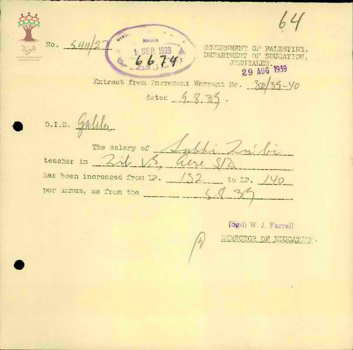 رسالة من مدير المعارف الى مفتش المعارف بخصوص زيادة راتب المعلم صبحي الزعبي السنوية