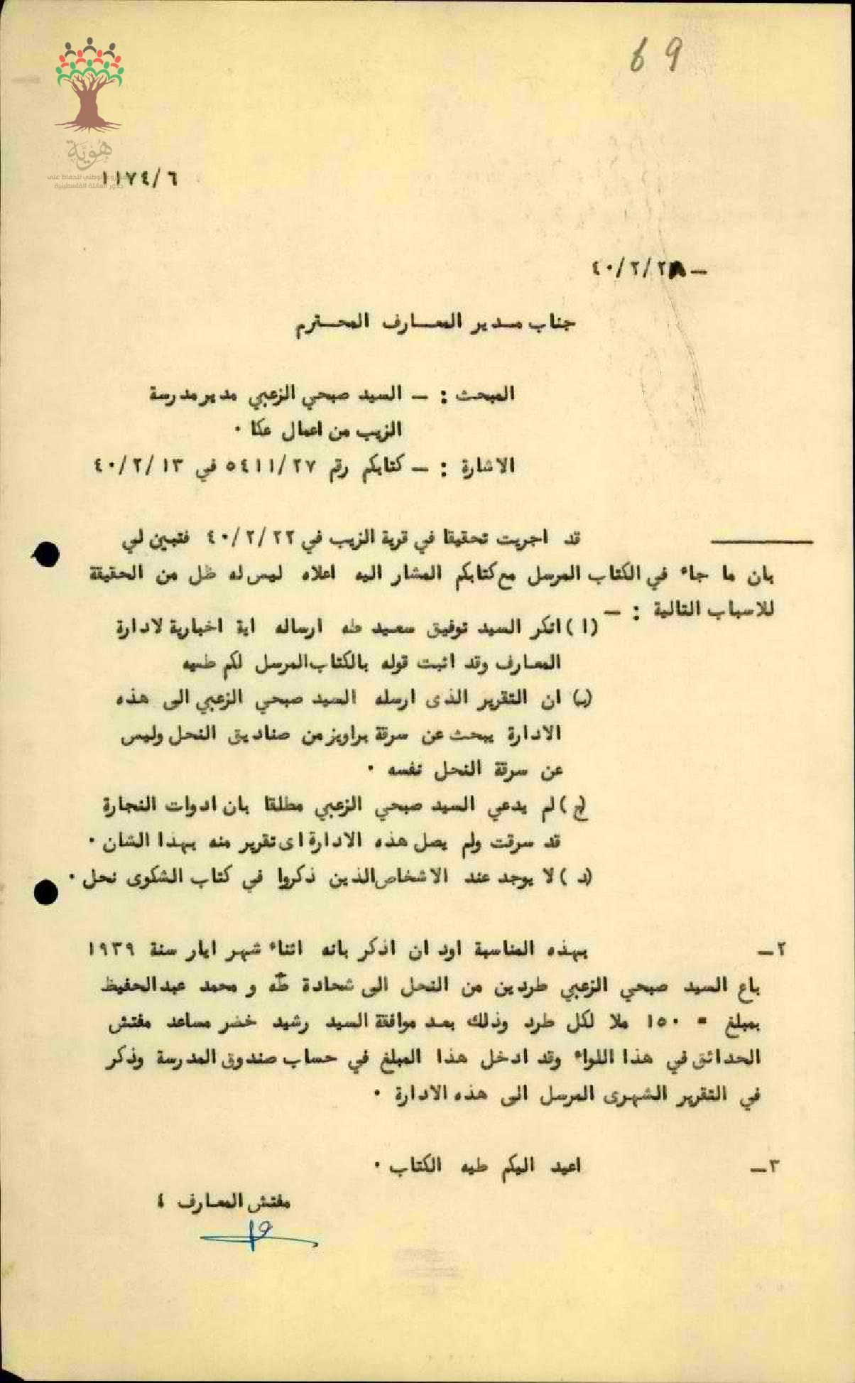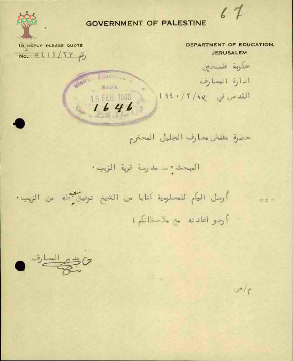 رسالة من مفتش المعارف الى مدير المعارف بخصوص عدم صحة القضية ضد المعلم صبحي الزعبي