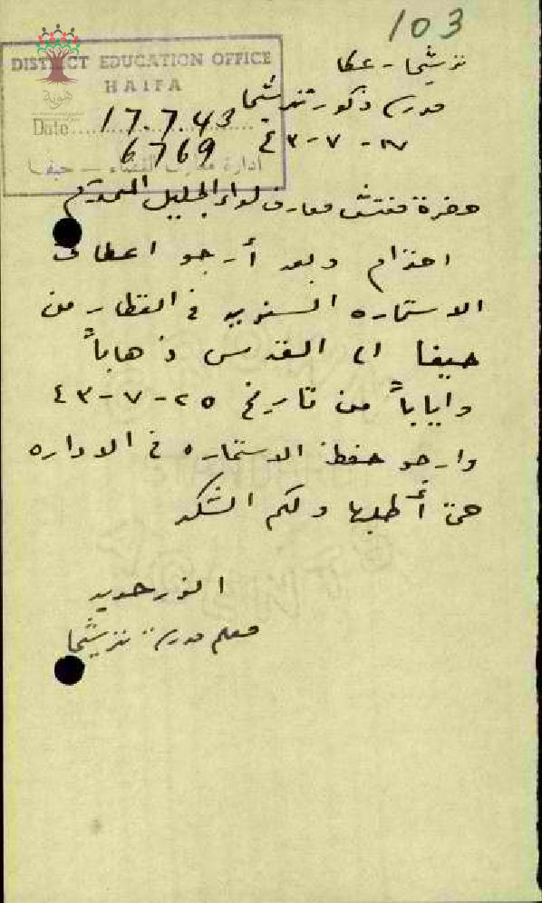 رسالة بخصوص استمارة السفر السنوية للمعلم انور حديد في القطار من حيفا الى القدس ذهابا وايابا