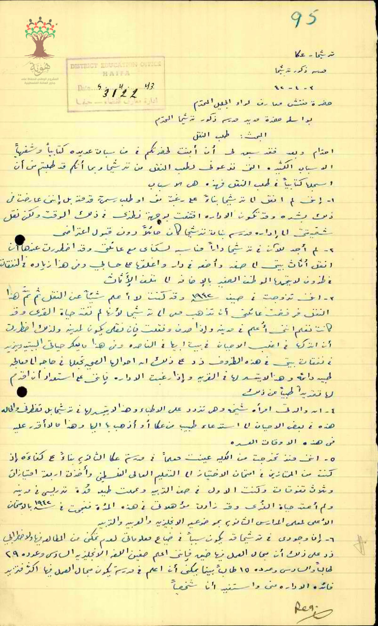 رسالة من المعلم انور حديد الى مفتش معارف الجليل بخصوص طلب النقل فقد سبق لي ان ابين لحضرتكم في مناسبات عديده كتابيا وشفهيا الاسباب كثيرا التي تدعوني وطلب النقل من ترشيحا