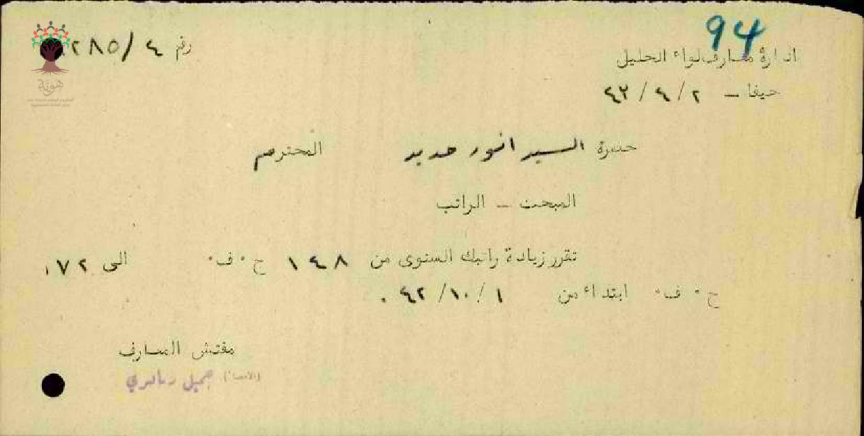 رسالة من مفتش المعارف الى المعلم انور حديد بخصوص تقرير زيادة الراتب السنوي