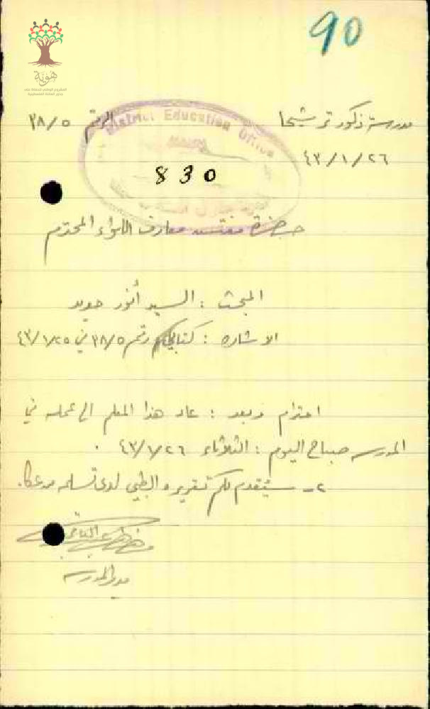 رسالة من مدير المدرسة الى مفتش معارف الجليل بخصوص عودة المعلم انور حديد الى عمله في المدرسة صباح اليوم الثلاثاء