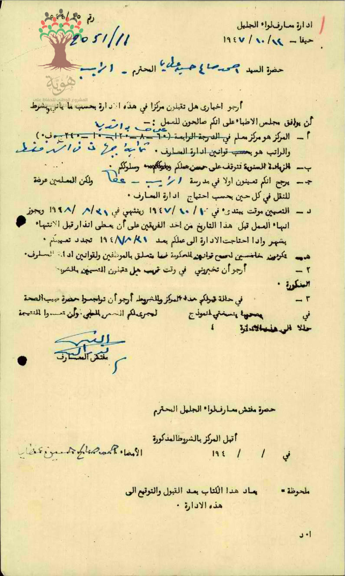 عقد تعيين احمد صالح عطايا معلماً في مدرسة الزيب