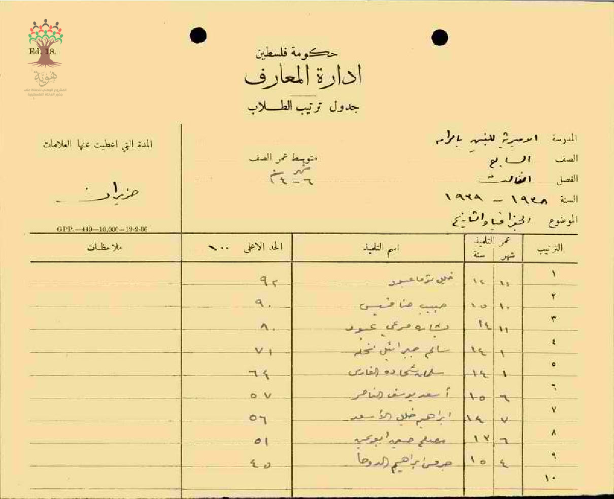 وثيقة جدول ترتيب الطلاب مدرسة الاميرية للبنين بالرام الصف السابع الفصل الثالث مادة الجغرافية والتاريخ