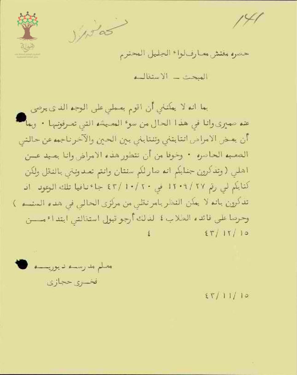 رسالة من فخري حجازي الى مفتش معارف لواء الجليل المبحث الاستقالة