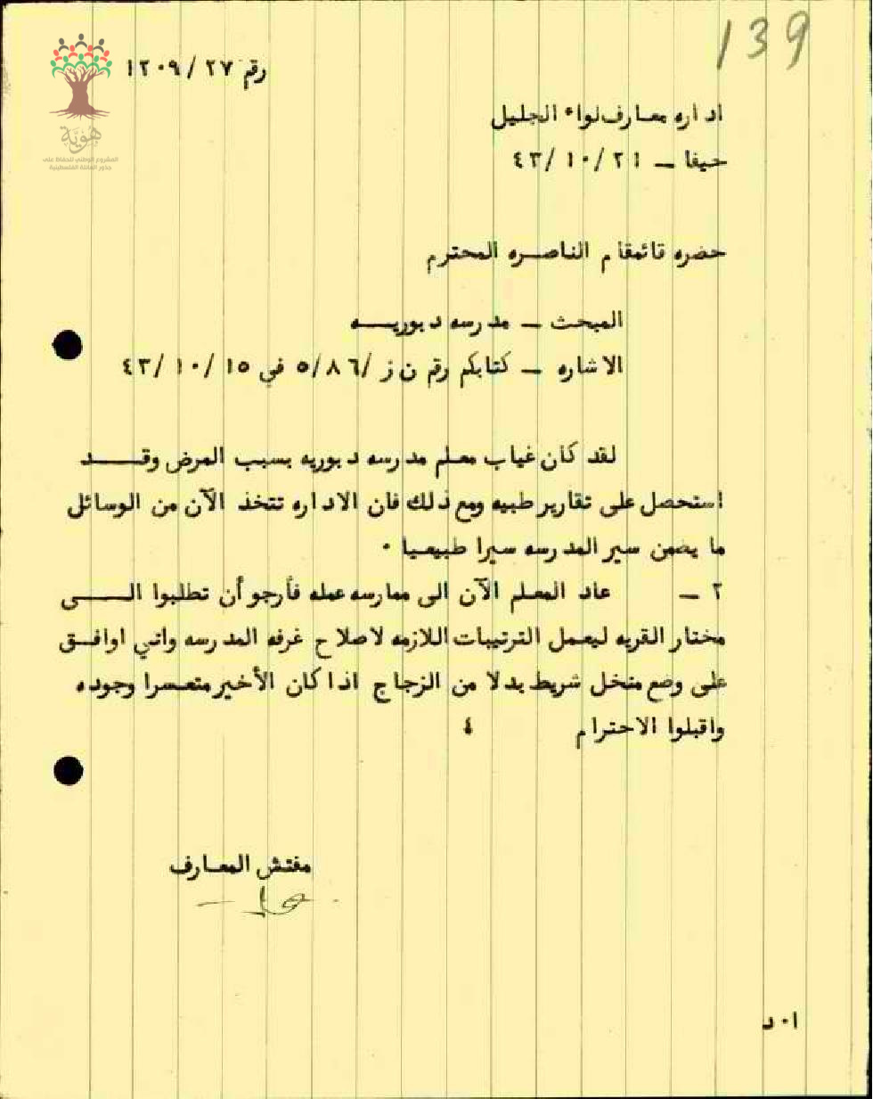 رسالة من مفتش المعارف الى حضرة قائم مقام الناصرة:المبحث مدرسة دبورية بخصوص غياب المعلم مدرسة دبورية