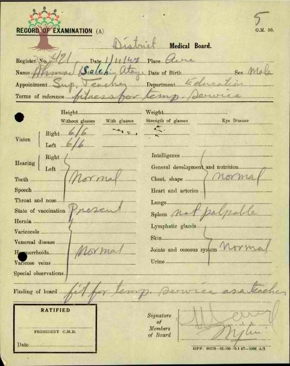 نتيجة الفحص الطبي للمعلم احمد صالح عطايا عند تعيينه في ادارة المعارف