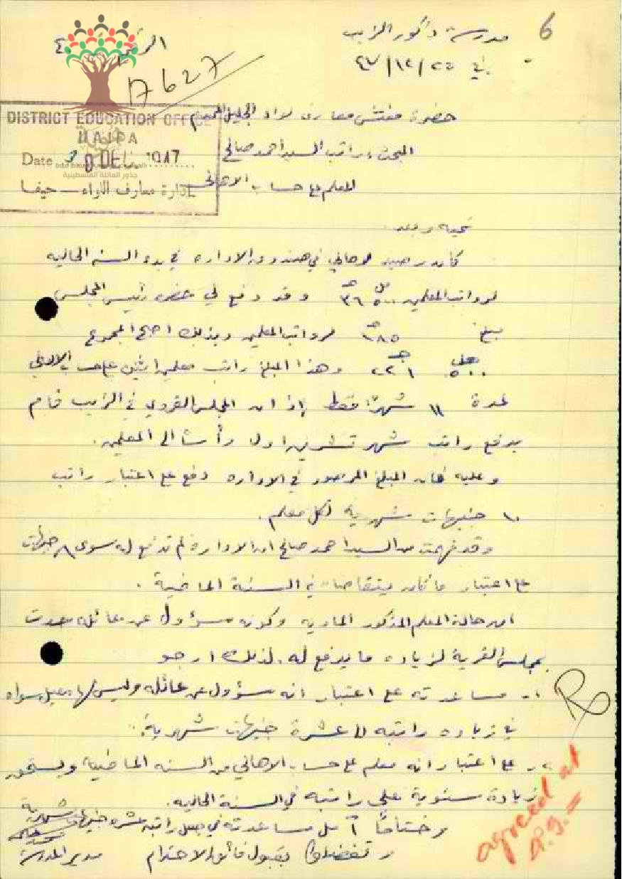 رسالة من مدير مدرسة الزيب إلى مفتش المعارف لزيادة راتب المعلم احمد صالح عطايا