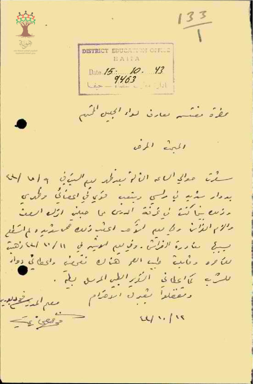 رسالة من معلم المدرسة في دبورية فؤاد حجازي إلى مفتش المعارف بخصوص المرض