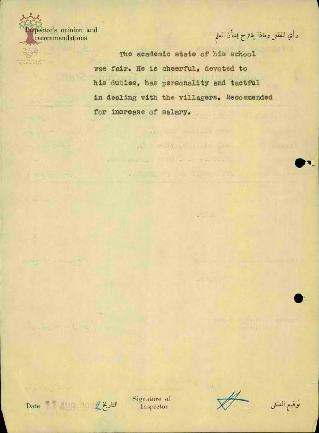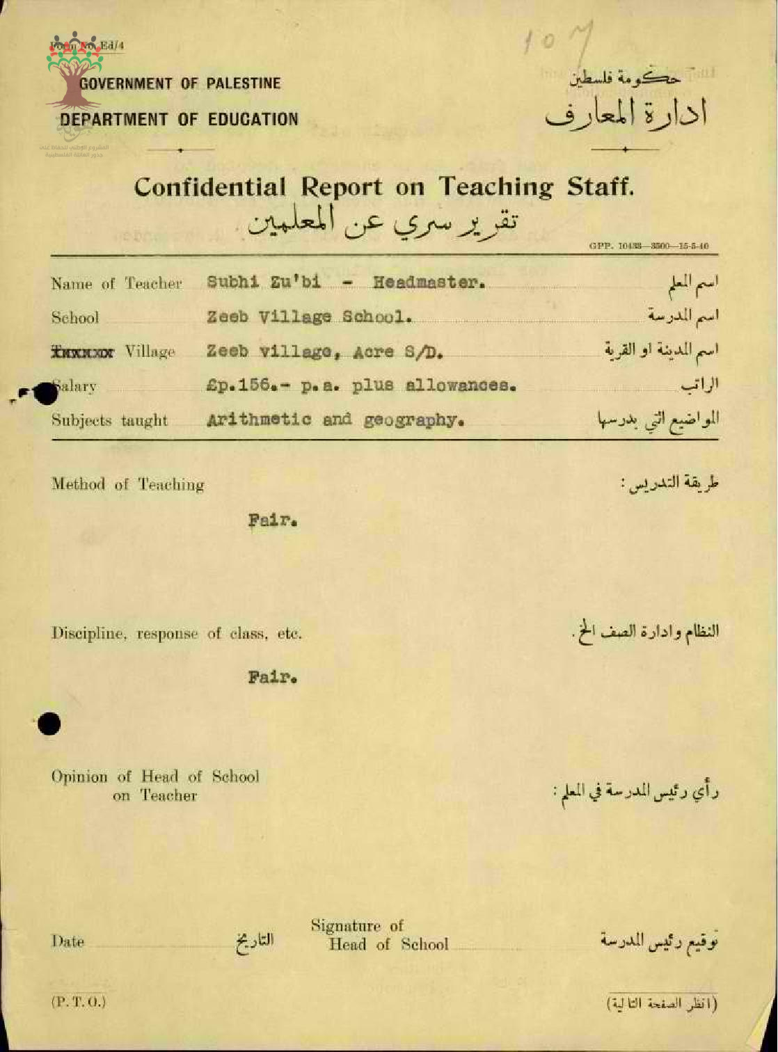 تقرير تفصيلي عن أداء المعلم صبحي الزعبي في مدرسة الزيب سنة 1942