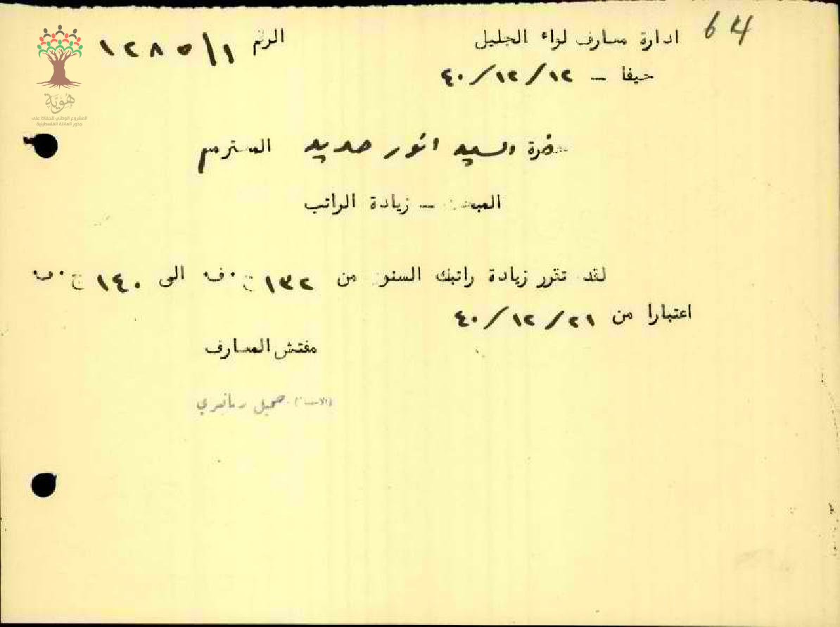 رسالة من مفتش المعارف الى المعلم انور حديد بخصوص تقرير زيادة راتبه السنوي