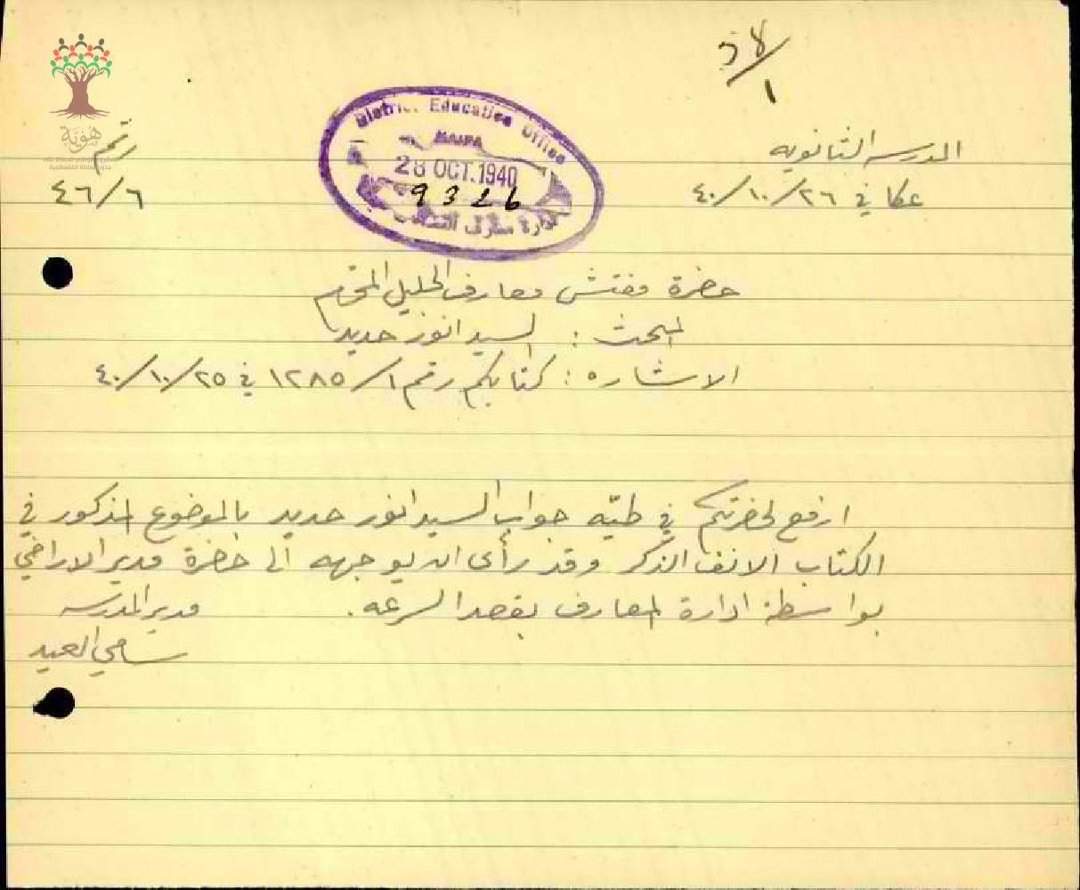 رسالة من مدير المدرسة الى مفتش معارف الجليل بخصوص المعلم انور حديد ارفع لحضرتكم في طية جواب المعلم انور حديد