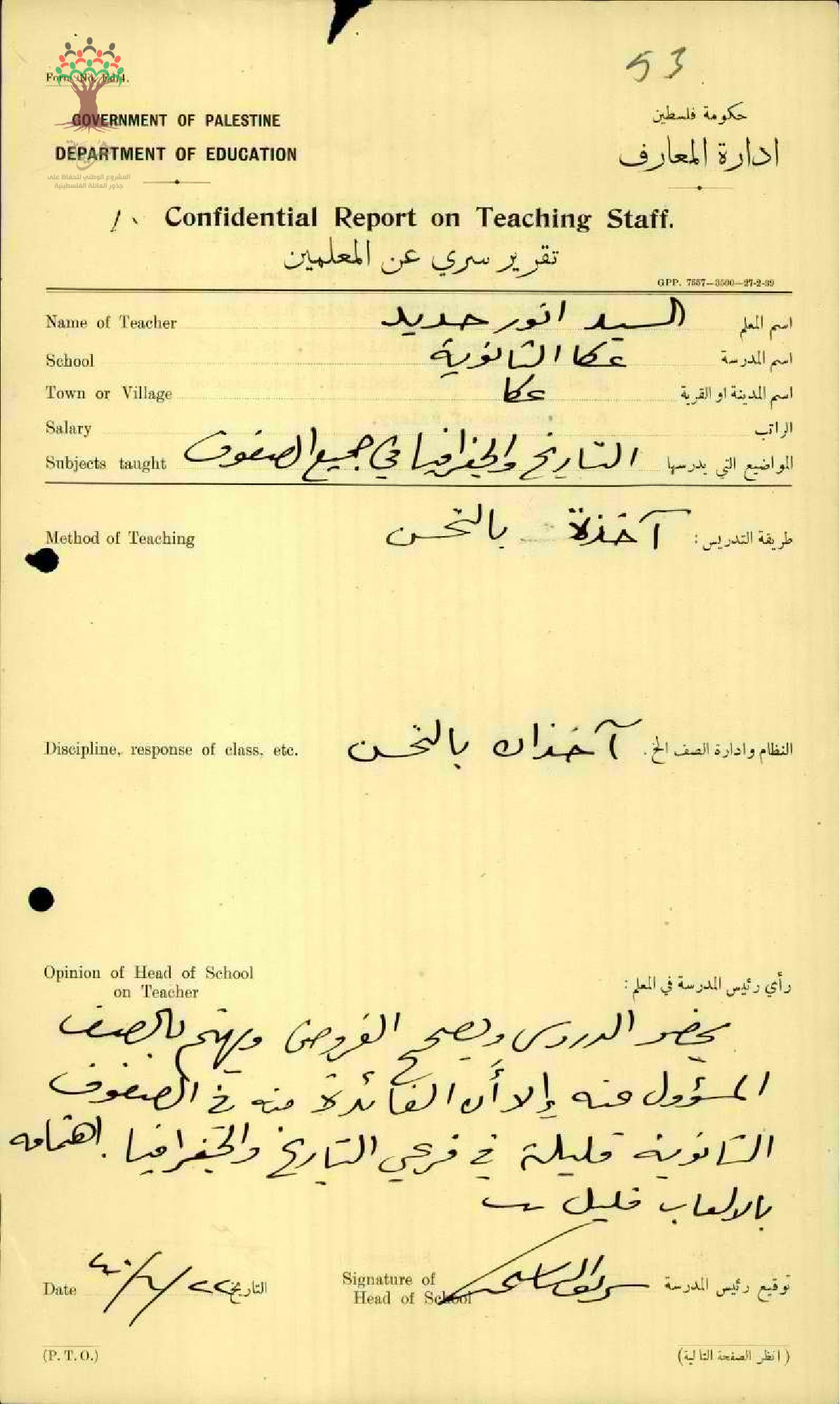 تقرير سري عن المعلم انور حديد في مدرسة عكا الثانوية