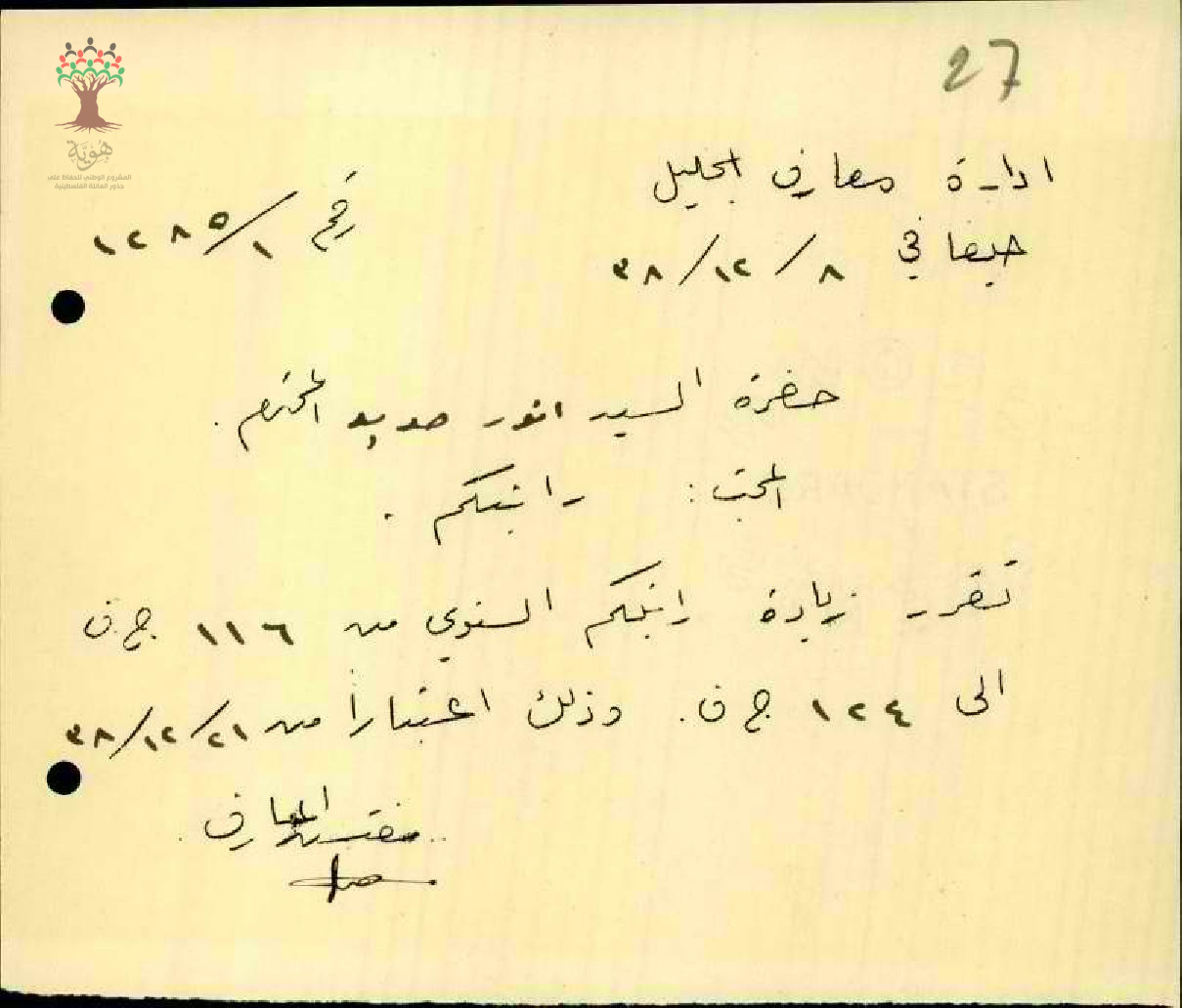 رسالة من مفتش المعارف الى المعلم انور حديد بخصوص تقرير زيادة راتبكم السنوي