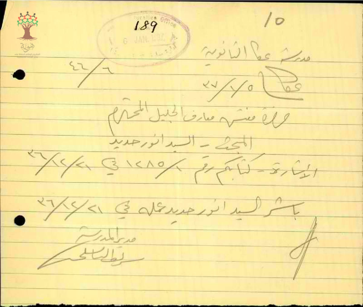 رسالة من مدير المدرسة الى مفتش معارف الجليل بخصوص عودة المعلم انور حديد الى عمله