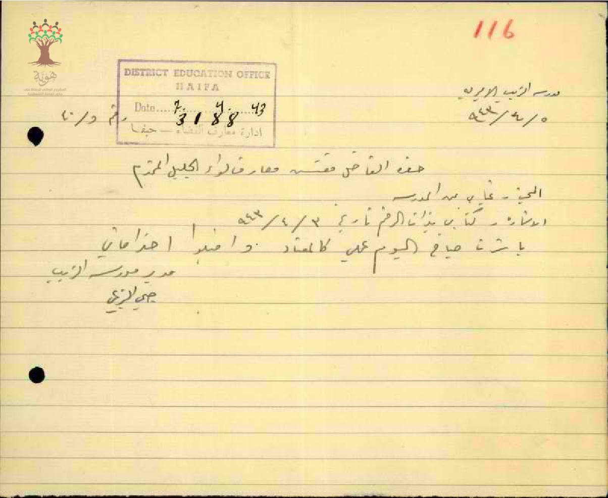رسالة من المعلم صبحي الزعبي الى مفتش المعارف يخبره بعودته الى العمل
