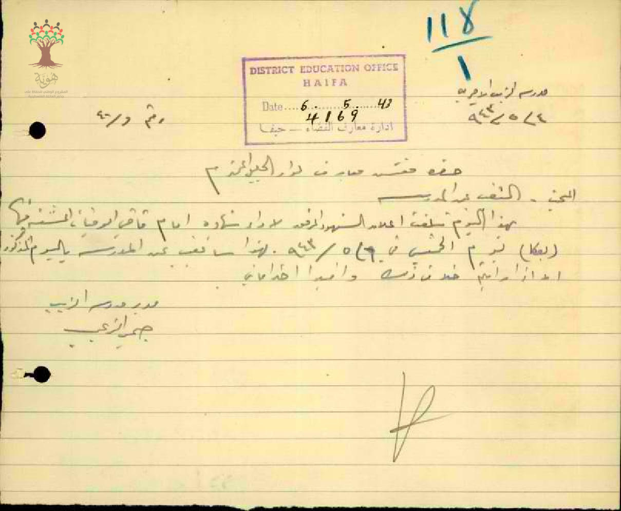 رسالة من المعلم صبحي الزعبي الى مفتش المعارف يطلب التغيب عن العمل بسبب حضور إعلان شهود