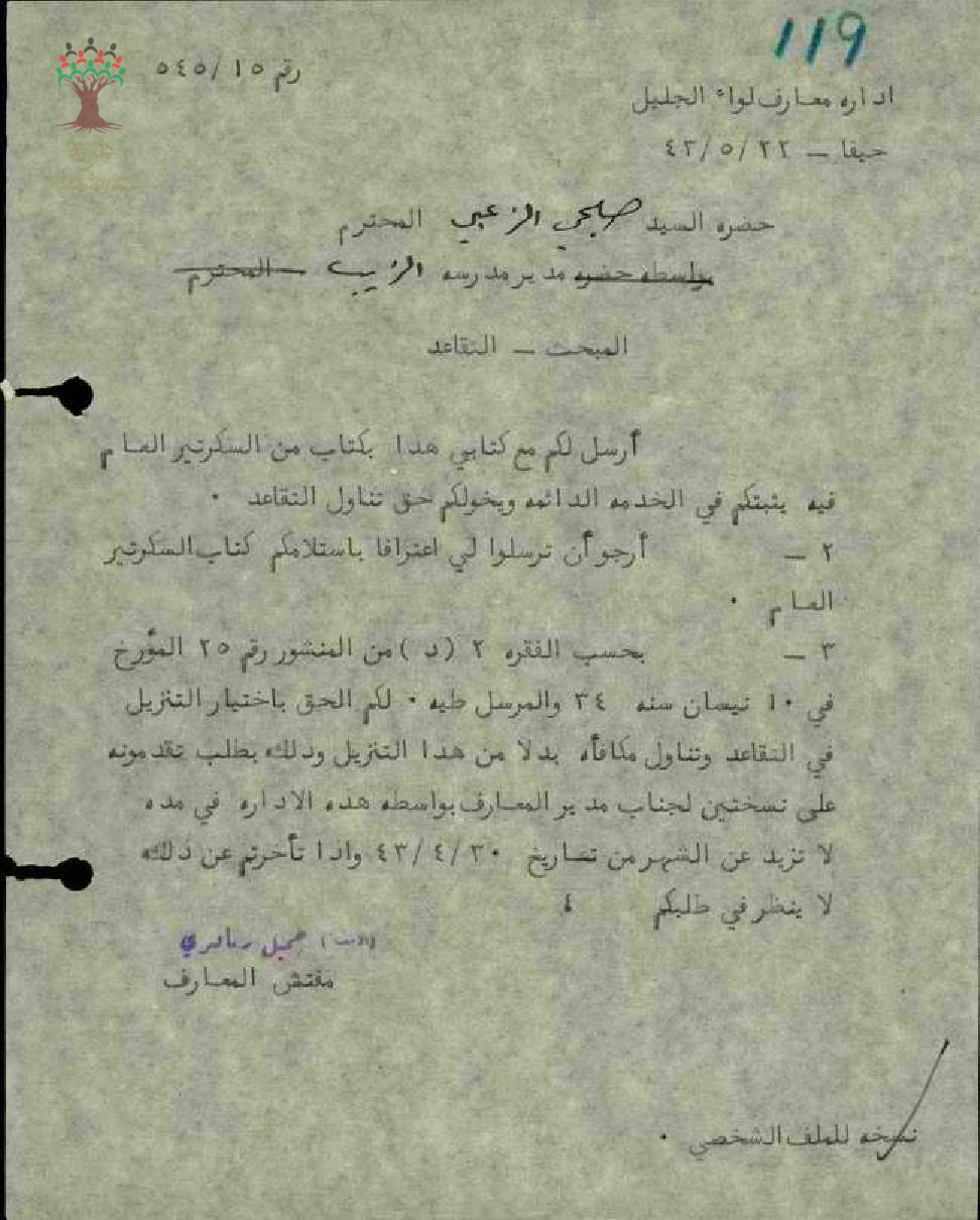رسالة من مفتش المعارف الى المعلم صبحي الزعبي بخصوص حقه في تناول التقاعد