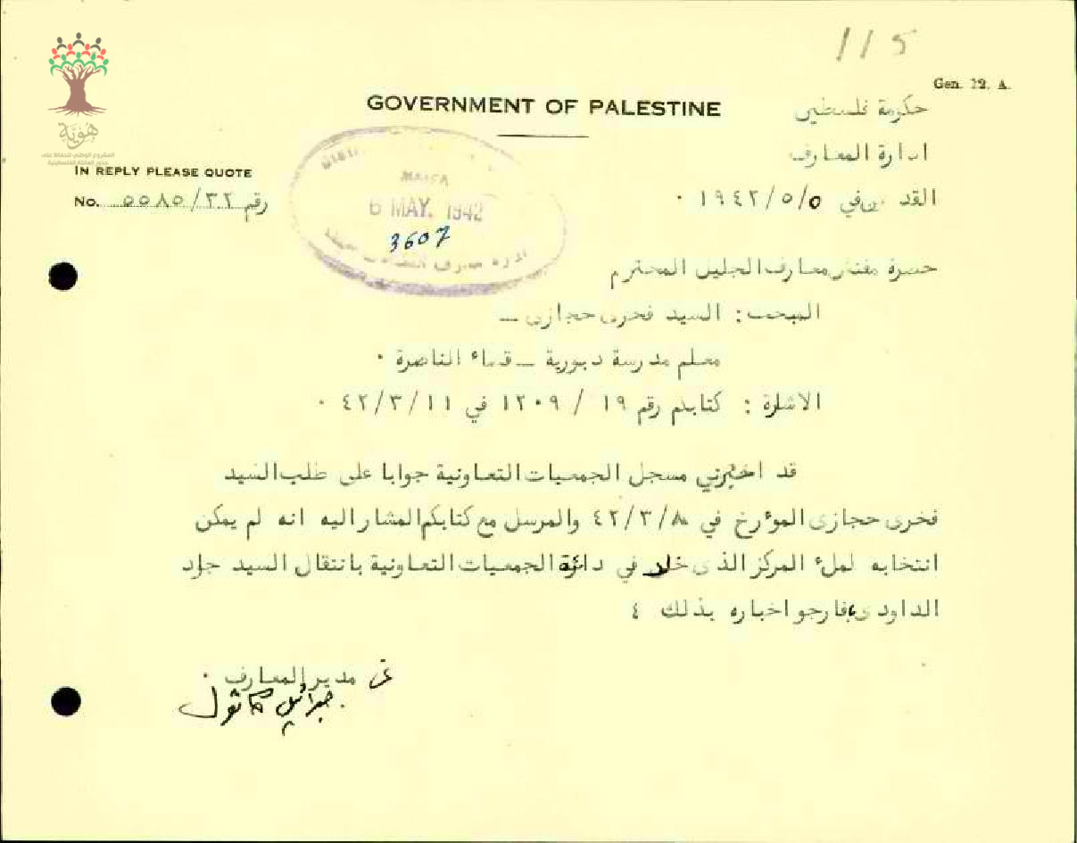 رسالة مدير المعارف إلى مفتش المعارف بخصوص المعلم فخري حجازي ردا على كتابكم لعدم ترشيحه في الجمعيات التعاومية