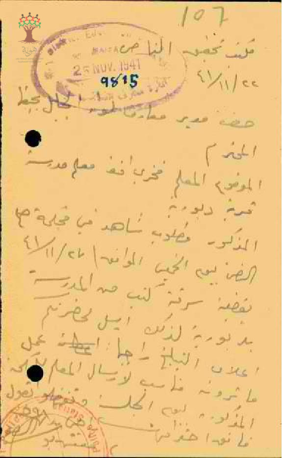 رسالة من مفتش المعارف إلى مدير المعارف بخصوص المعلم فخري حجازي معلم مدرسة دبورية مطلوب كشاهد في قضية سرقة كتب مدرسة دبورية