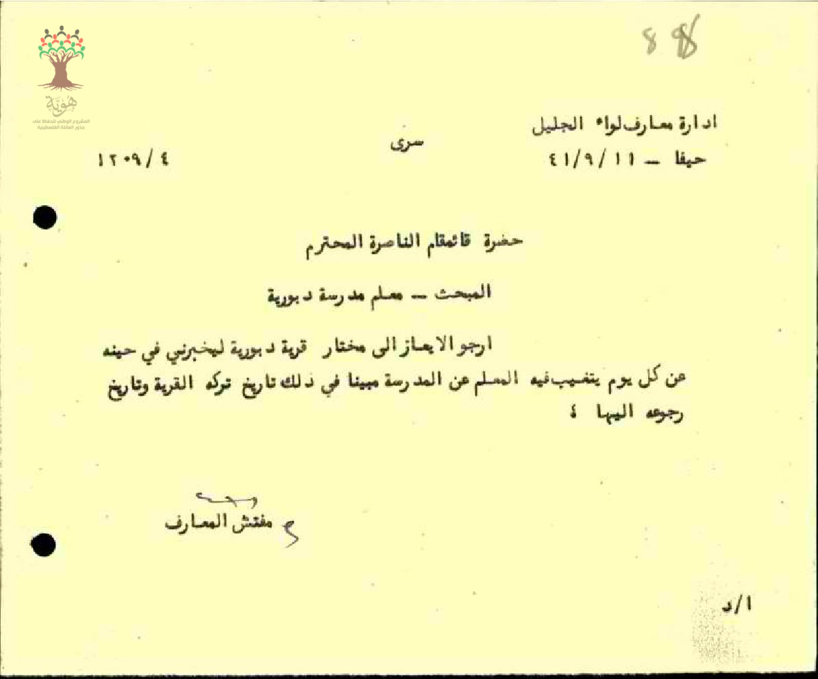 رسالة من مفتش المعارف الى حضرة قائم مقام الناصرة المحترم اعاز مختار قرية دبورية عن كل يوم يتغيب فيه المعلم فخري حجازي عن المدرسة