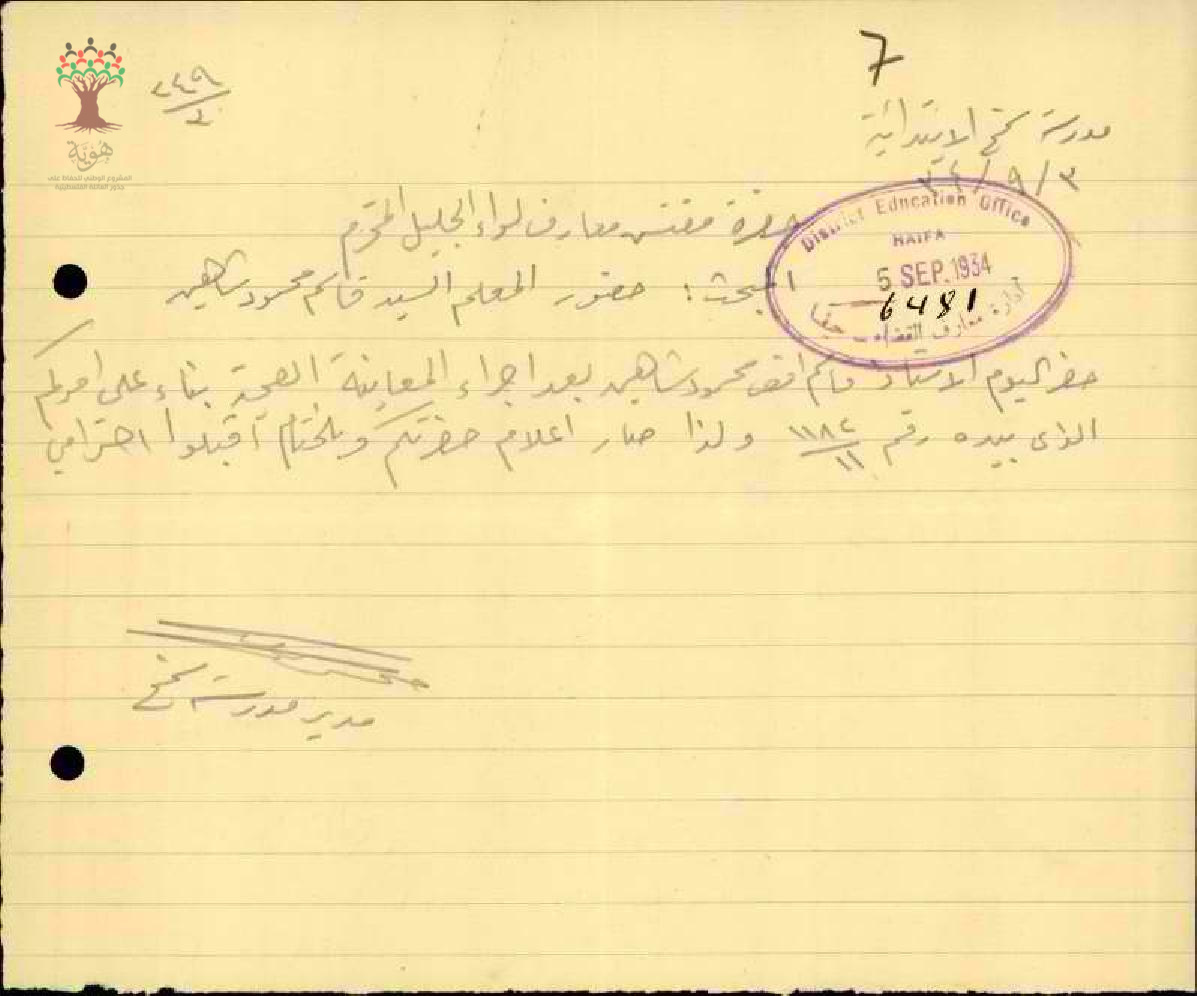 حضور المعلم قاسم شاهين لأجراء الفحص الطبي بناء على طلب مفتش المعارف