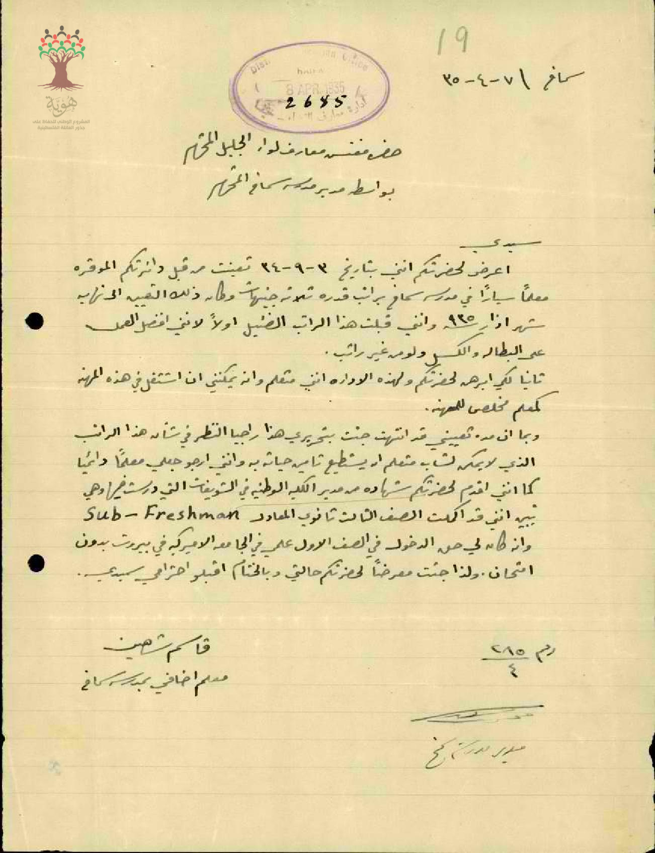 رسالة مقدمة من المعلم قاسم شاهين يطلب فيها تعيينه معلماً دائماً