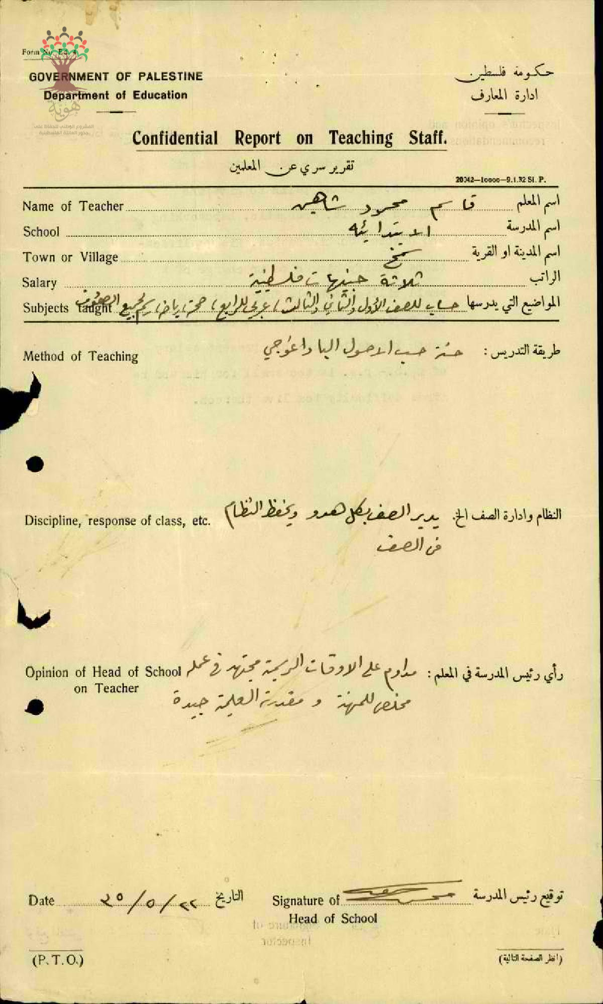 تقرير تفصيلي حول اداء المعلم قاسم شاهين من مدرسة سمخ، يتحدث فيه مدير مدرسة سمخ عن مناقب المعلم المذكور وانه مجتهد ومحافظ على النظام اضافة الى قدراته التعليمية الجيدة