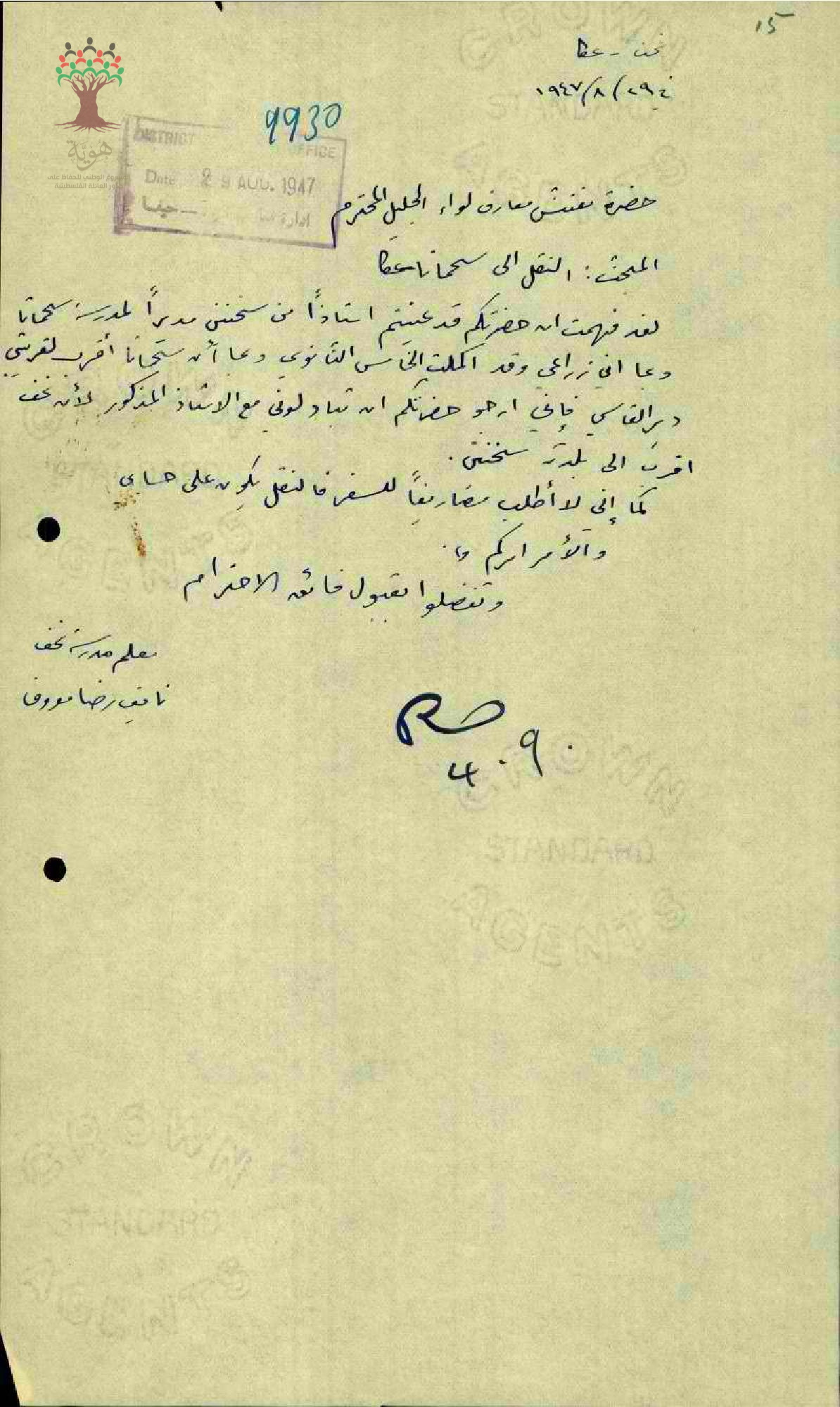 رسالة من المعلم نايف رضا معروف الى مفتش معارف الجليل بخصوص النقل الى سحماتا ولقد فهمت ان حضرتكم قد عينتم استاذا من سنتين لمدرسة سحماتا