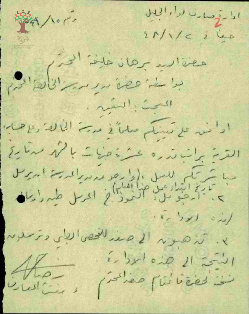رسالة من مفتش المعارف إلى المعلم برهان خليفة يخبره بموافقته على تعيينه معلماً في مدرسة الخالصة على حساب أهل القرية