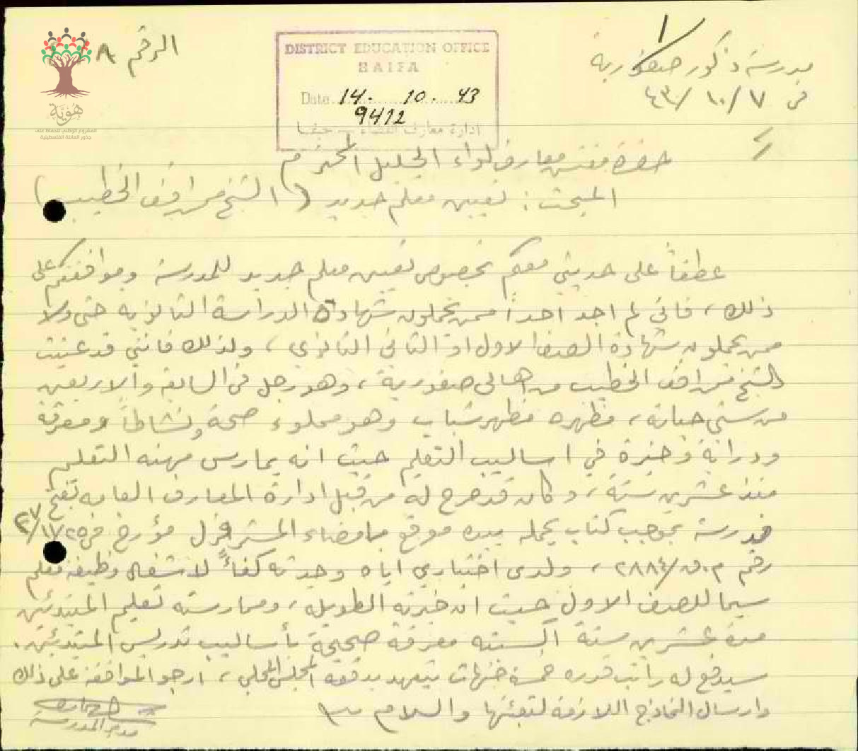 طلب تعيين محمد الشيخ يوسف الخطيب معلما في مدرسة ذكور صفورية، بناء على توصيات مدير مدرسة ذكور صفورية وبعد انه لم يجد اي مدرساً من حاملي الشهادات