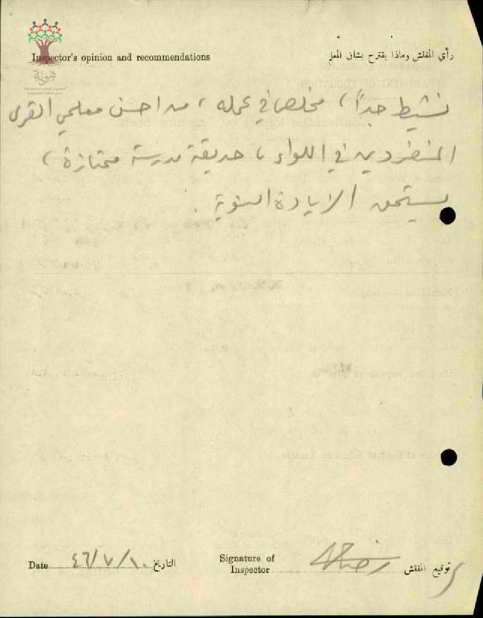 راي المفتش في المعلم محمد علي عودة _نشيط جدا مخلص في عمله من احسن معلمي القري