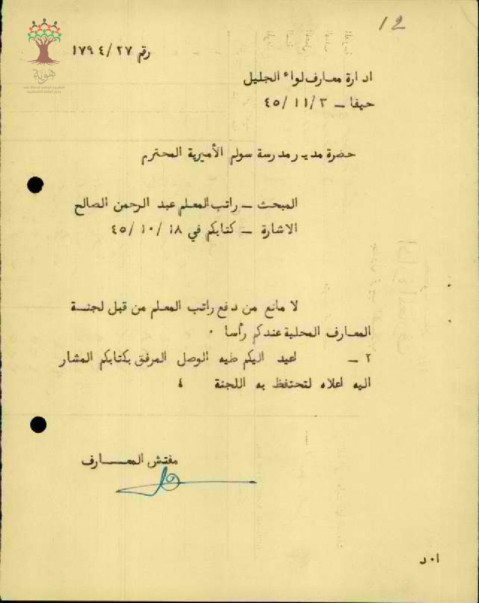 موافقة مفتش المعارف على دفع لجنة المعارف المحلية في قرية سولم لدفع راتب المعلم عبد الرحمن علوش في مدرسة سولم في صفورية