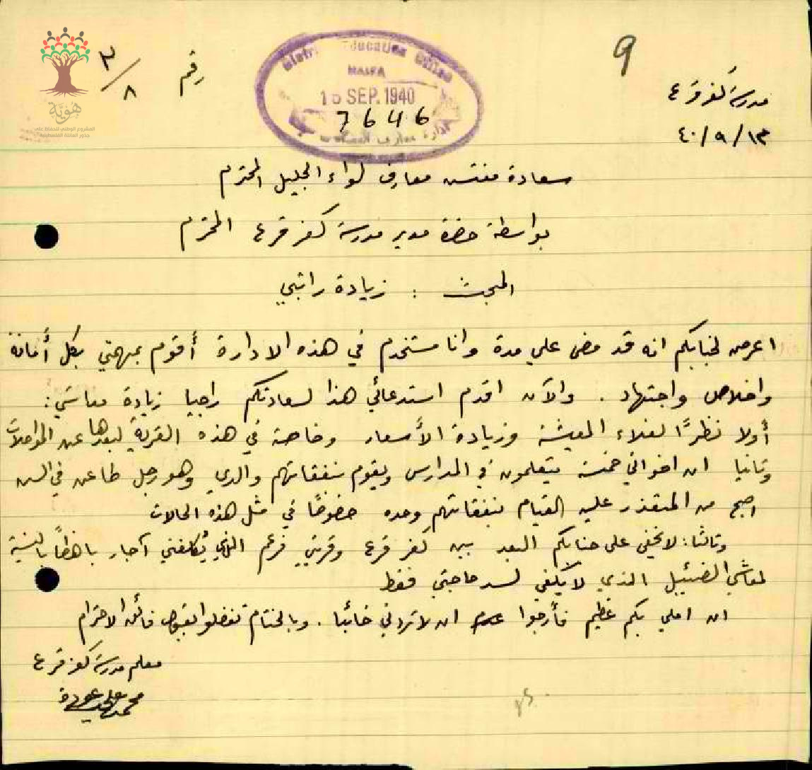 رسالة من المعلم محمد علي عودة الى مفتش معارف الجليل بخصوص زيادة الراتب اعرض لجانبكم انه قد مضى علي مدة وانا مستخدم في هذه الادارة واقوم بمهمتي بكل امانة واخلاص واجتهاد