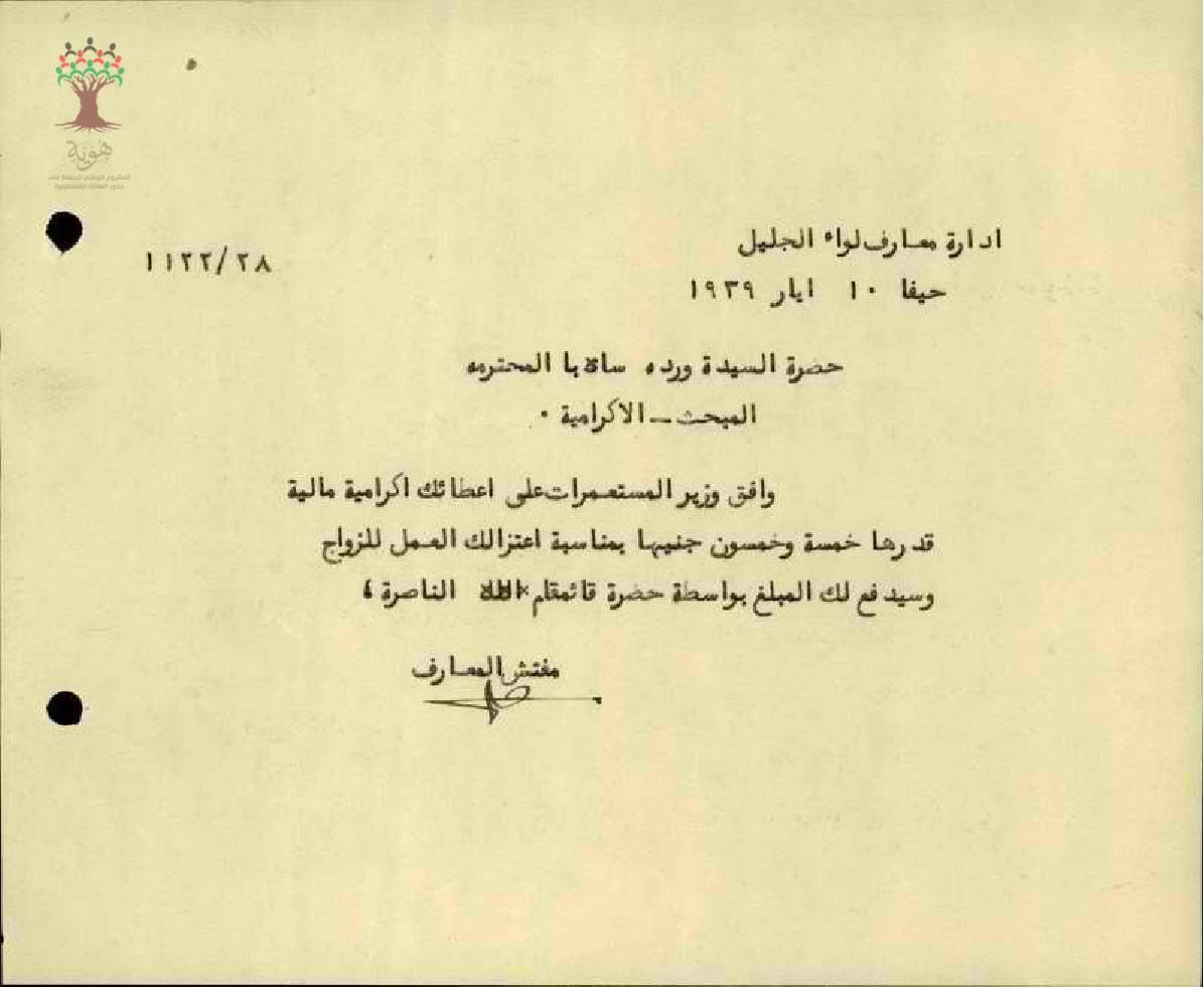 رسالة من مفتش المعارف الى المعلمة وردة سابا بخصوص الاكرامبة وافق وزيرا المستعمرات على اعطائك اكرامية مالية قدرها خمسة وخمسون جنيها بمناسبة اعتزلك العمل للزواج