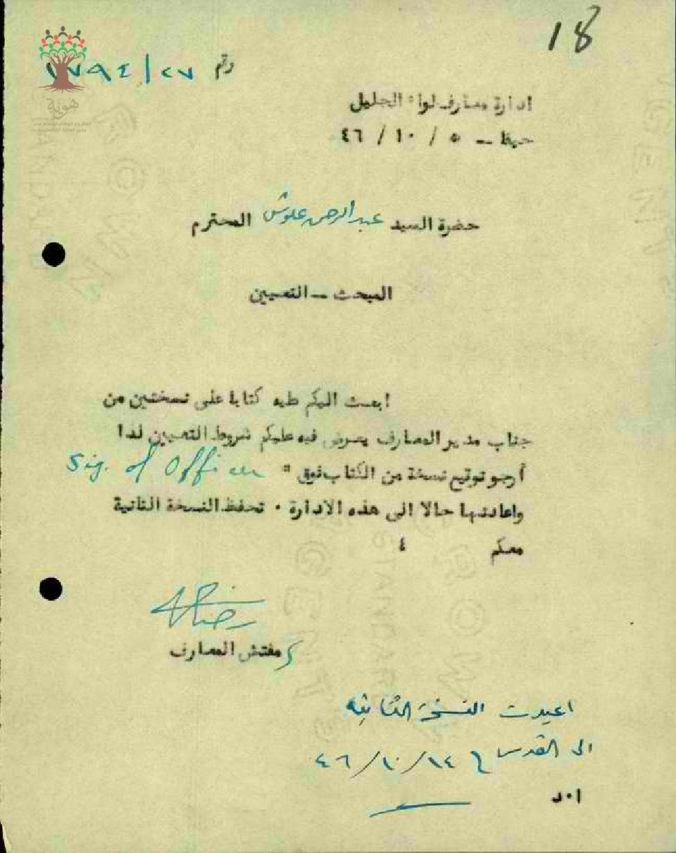رسالة مرفقة بشروط تعيين المعلم عبد الرحمن علوش في مدرسة سولم