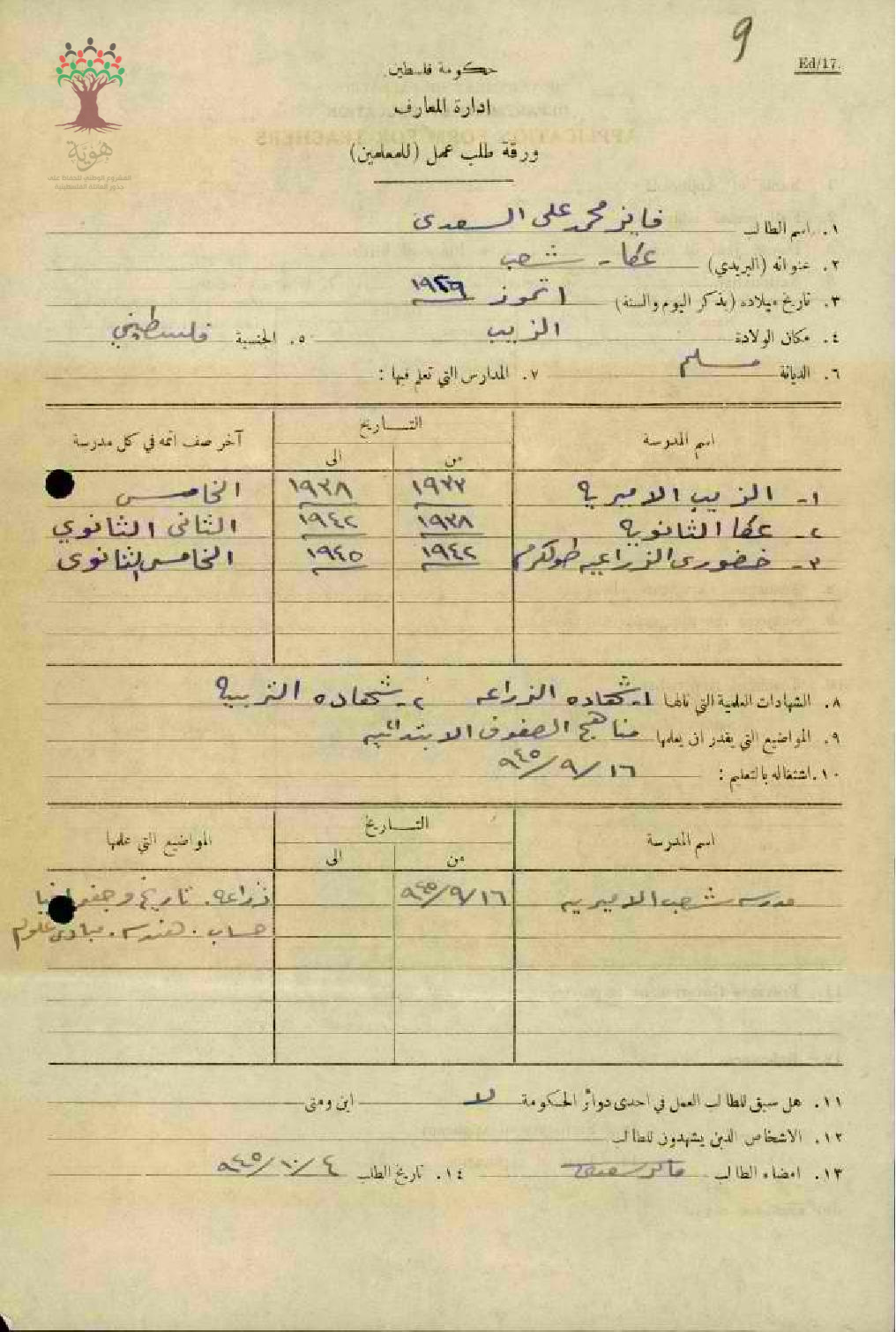 طلب عمل مقدم من المعلم فايز محمد السعدي من مدرسة شعب يذكر فيه مؤهلاته العلمية