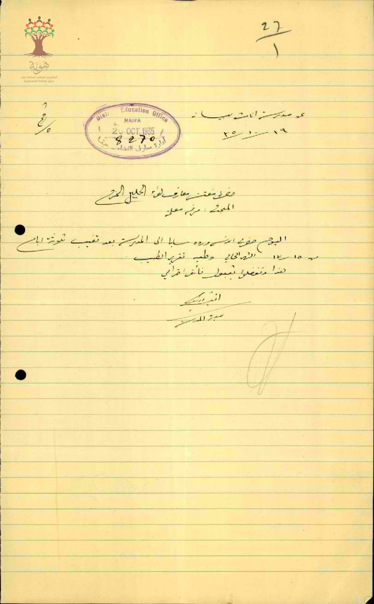 رسالة من مديرة المدرسه الى مفتش معارف الجليل بخصوص عودة المعلمة وردة سابا الى المدرسة بعد الغيب بسبب المرض