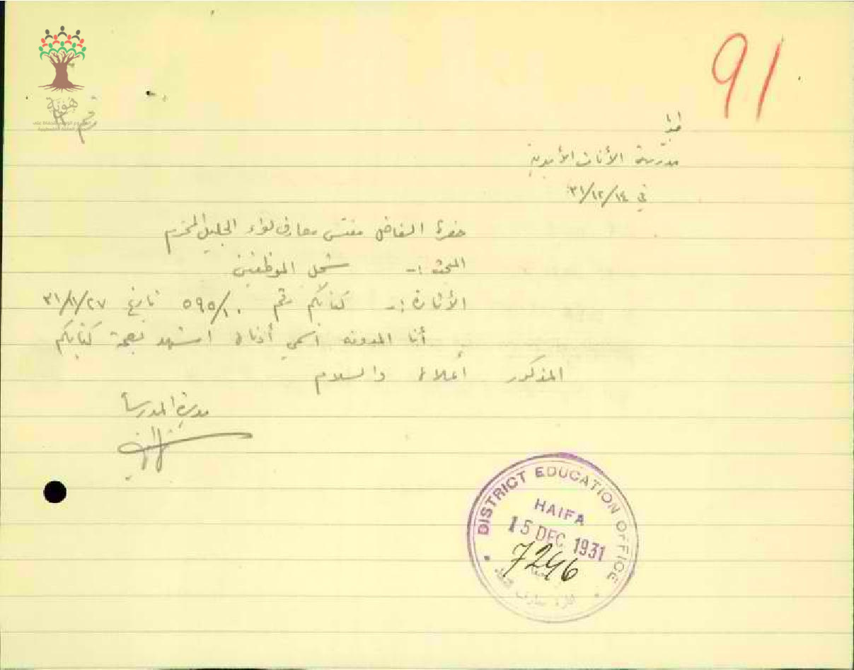 رسالة من مديرة المدرسة الى مفتش معارف الجليل انا المدونة اسمي ادناه اشهد بصحة كتابكم المذكور اعلاه