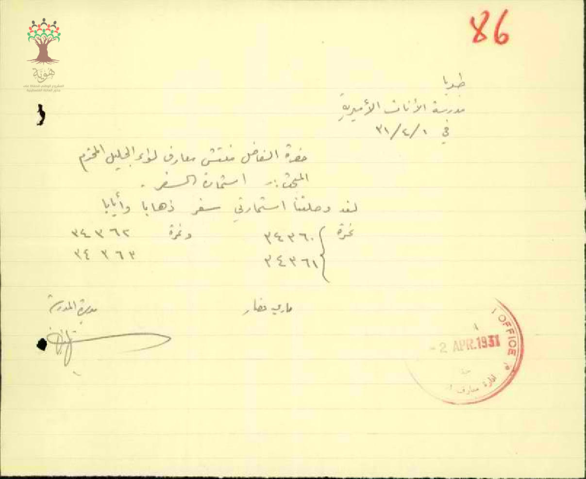 رسالة من المعلمة نهايات ايراني الى مفتش معارف الجليل لقد وصلتني استمارة سفر ذهاب واياب